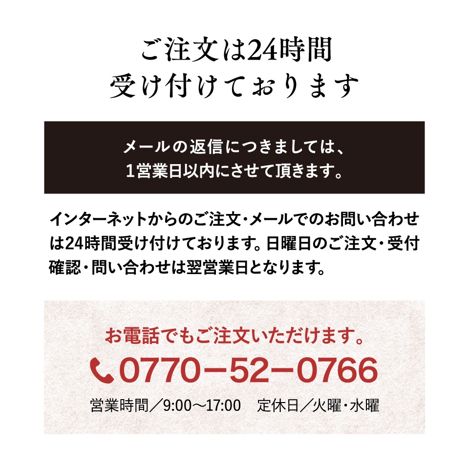 お電話でもご注文いただけます。0770-50-1495営業時間/9:00〜17:00 定休日/火曜・水曜
